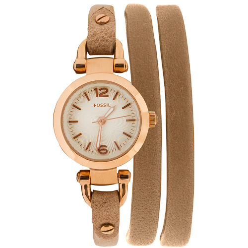 Золотистый цвет корпуса, бежевый браслет и светло-бежевый циферблат.